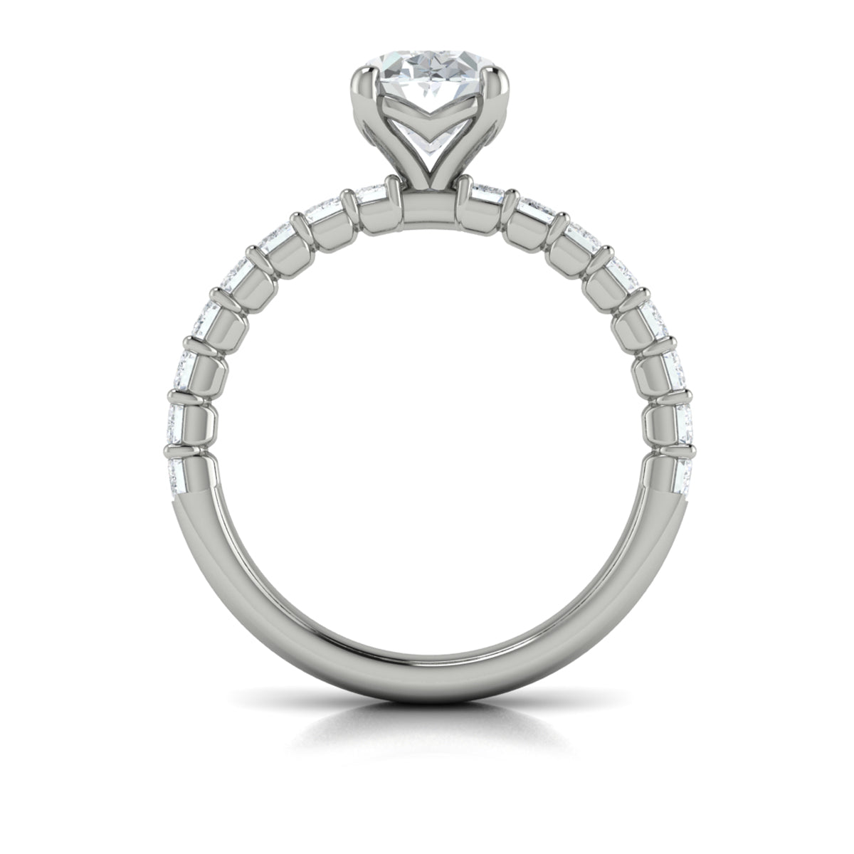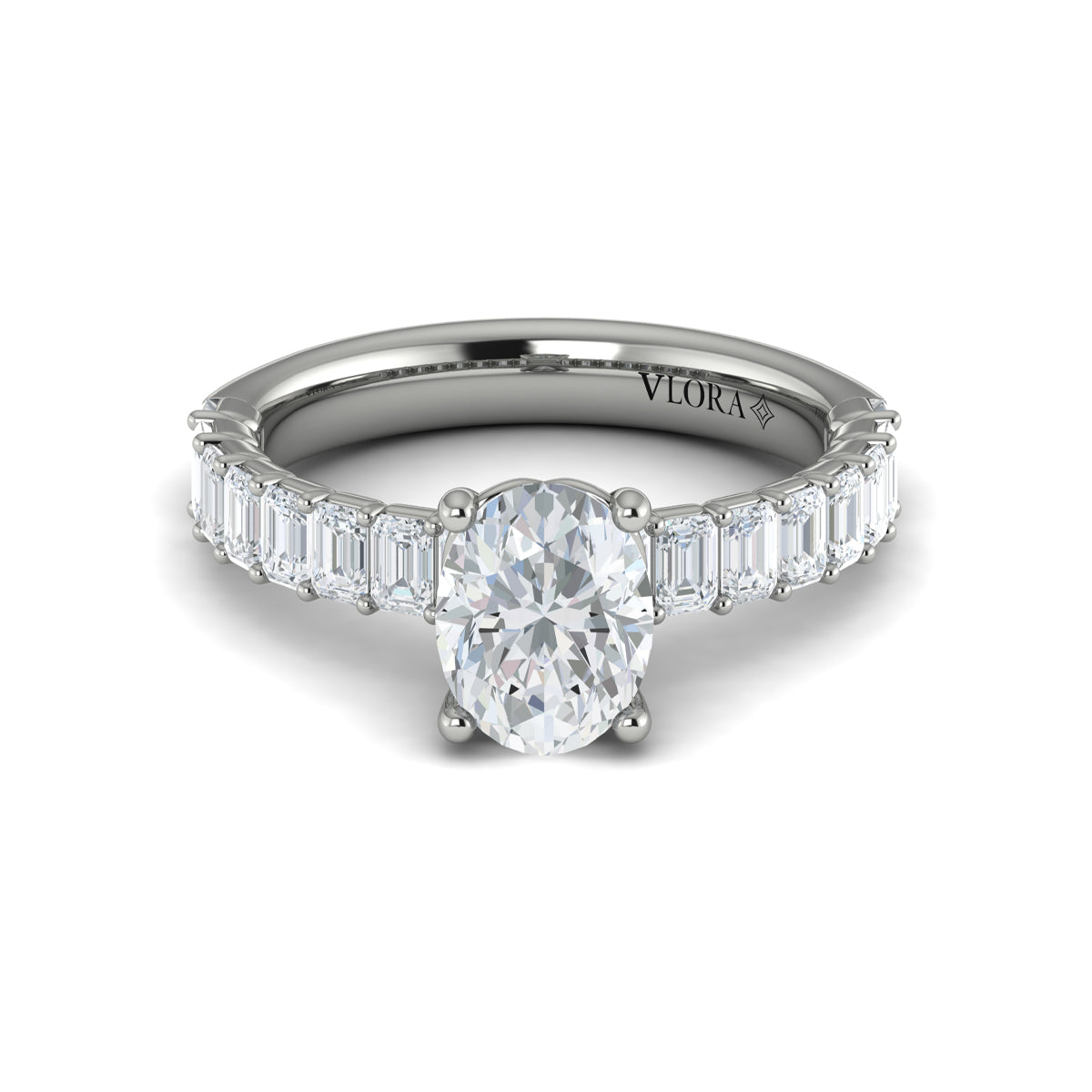 Art Deco elegance meets modern drama in this oval engagement ring that stands out from the crowd with sophisticated style. Emerald cut accent diamonds blaze across the band, reflecting and refracting like an endless hall of mirrors. The center oval shape diamond is raised in the Vlora signature V-setting, which is beautifully crafted to allow light to enter the stone, maximizing brilliance and radiance. This perfect fit engagement ring will stack beautifully with your wedding band. The unusual combination of oval and emerald cuts is the perfect choice for a woman who's always ahead of the curve.