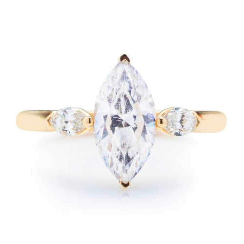 This unique engagement ring showcases a brilliant marquise-cut center stone, complemented by two marquise side stones turned East-West for a contemporary touch. Crafted to symbolize your love story, it's an elegant choice for a timeless commitment.