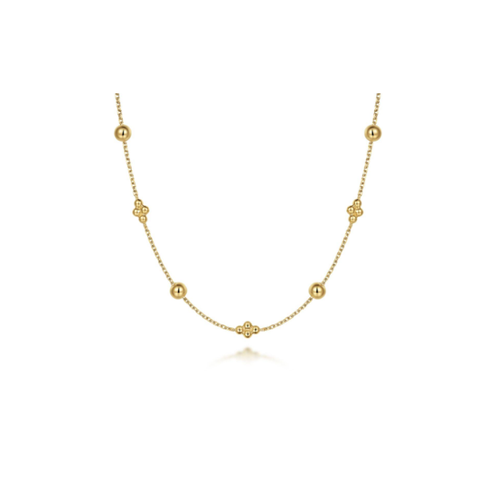 A clean, easy necklace in 14K yellow gold featuring Gabriel’s signature Bujukan beaded details spaced along a delicate chain. Lightweight and effortless, it sits beautifully on its own or layered with your everyday favorites. Simple, polished, and made to wear on repeat.