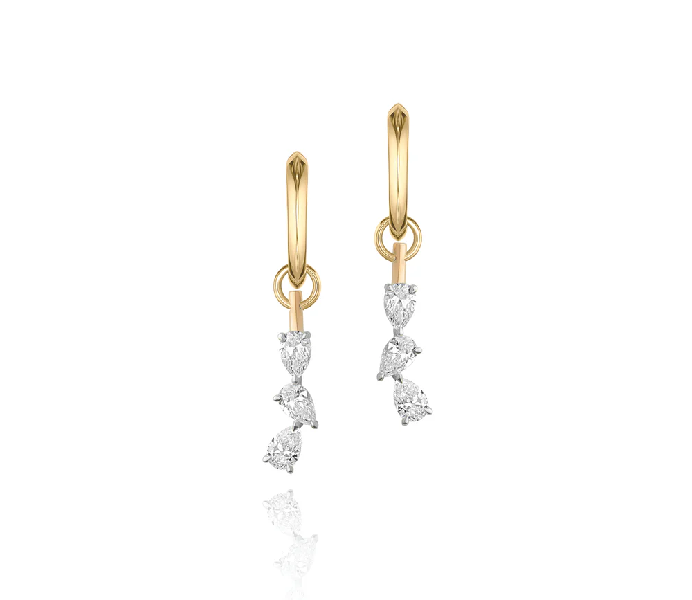A modern take on the classic drop. Three pear-shaped diamonds set in 18k yellow gold, designed to move naturally with you.