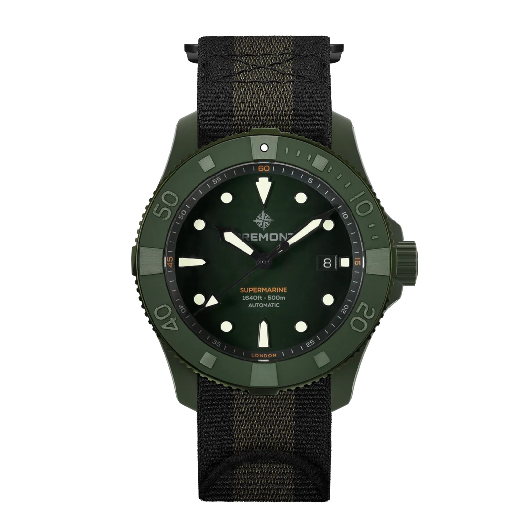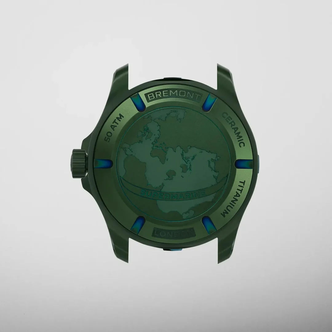 The Bremont Supermarine Full Ceramic is a high-performance dive watch with 500m water resistance and a helium escape valve. An evolution of our previous Supermarine 500M, the case has been re-designed in mono-block ceramic, a first for Bremont, with a titanium movement container and a new knurled uni-directional titanium bezel.