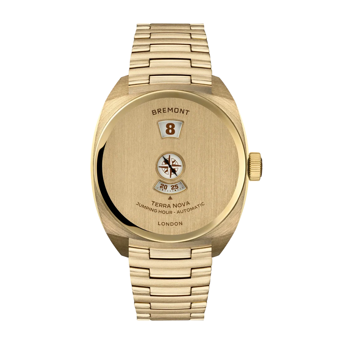 Inspired by early 20th-century trench watches, the Terra Nova Jumping Hour Bronze brings together vintage military styling and contemporary watchmaking innovation. Its compact 38mm cushion-shaped case is crafted from vertically brushed cupro-aluminium bronze, a high-performance alloy known for its strength and ability to develop a rich, even patina over time.