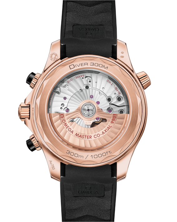 The watch is presented on a rubber strap and is driven by the OMEGA Master Chronometer Calibre 9901, which can be seen through the sapphire-crystal on the wave-edged caseback.