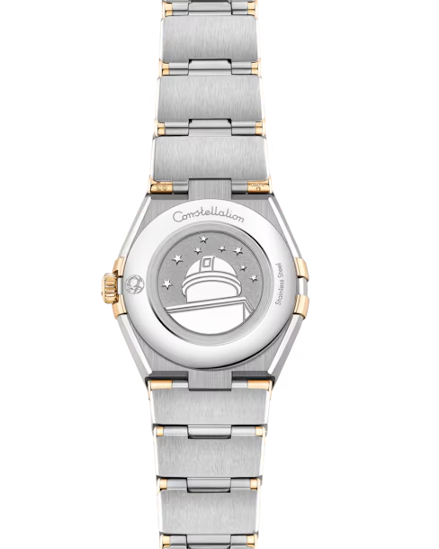 This 25 mm 18K yellow gold and stainless steel model features a bezel engraved with Roman numerals, white mother-of-pearl dial with diamond hour markers and scratch-resistant saphire crystal. The hands, OMEGA logo, Constellation star and diamond holders are also in 18K yellow gold.