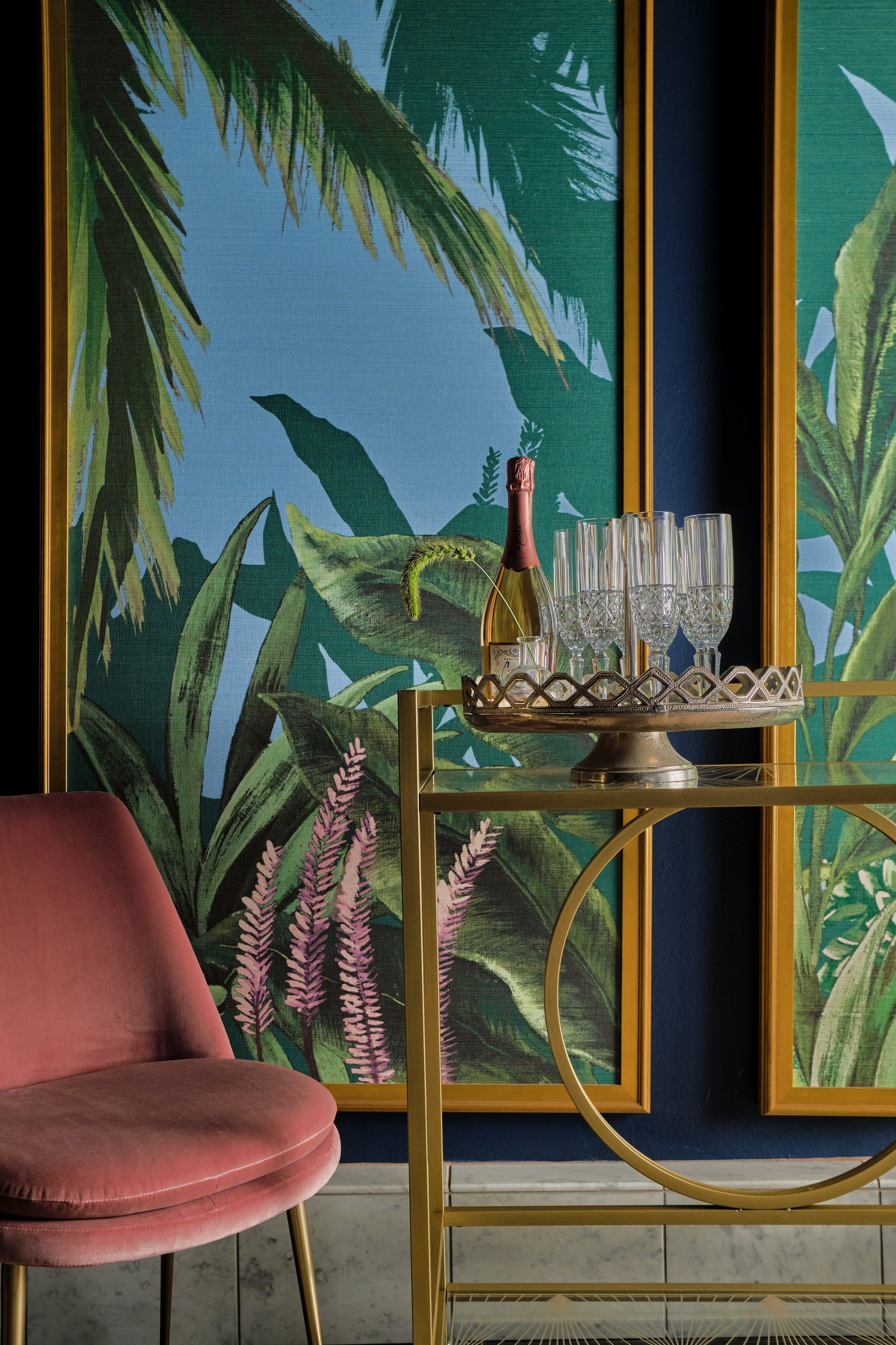 Shimmering with deco detailing, cloaked in jewel tones and rich velvet, The Vault is a unique, free space to mingle underneath the city. The Vault itself is stocked with a miniature beverage fridge tucked underneath a marble top bar. Sparkling glassware shimmers against a wood grained, blue and gold wallpaper opposite a grid of historic Richter & Phillips catalog memorabilia from the midst of the 1920s.
