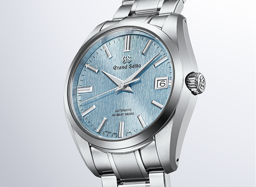 This creation exhibits a classic mechanical Grand Seiko case design with a 40mm case size. The dial evokes an icefall that one might encounter in the dead of winter on Mount Iwate, the imposing peak visible from the Grand Seiko Studio Shizukuishi, home to Grand Seiko mechanical watchmaking. Such frozen waterfalls are natural phenomena whereby the water flowing downward gradually solidifies when the temperature drops below freezing. This fantastic scene is depicted on the dial through the dynamic and detailed pattern, as well as a unique icy-blue color.